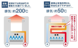 従来の給湯器は全熱量の80%程度しか回収されず、残りの20%は排気として捨てられていました。