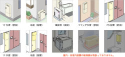 - アパート(集合住宅)ですとマンションの廊下など、ガスメーターなどが収められているパイプシャフト(PS)庫の中に設置されている「PSタイプ」、廊下の壁に埋め込まれる形になっていたり、扉の中に入っている場合もあります。また、ベランダの壁に設置され、本体の下から配管が出ているものは「壁掛タイプ」となります。