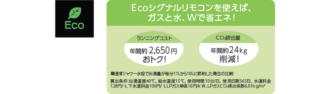 Ecoシグナル搭載リモコンであれば、最適な湯量時に点灯や点滅でお知らせしてくれます。特別な操作は必要なく、見える化によるエコ意識を進めようとする機能です。