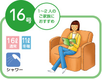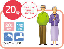 2人家族なら16号か20号の給湯器を選びます。 2人家族の場合、給湯器16号、20号で迷ってしまう人が多いようですが、給湯器20号だと少し余裕がもて快適に過ごせます。シャワーと台所の同時使用がなければ16号でも快適に過ごせます。ですが冬場にシャワーと台所を同時使用をした場合、給湯器16号だと物足りなさを感じることがあるので、余裕をもって20号を選ぶことをおすすめします。