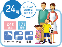 4人以上の家族なら24号の給湯器がお薦めです。 シャワー約17.8号、台所約4.8号、洗面所約4.8号となり、合計は27.4号必要な計算になりますが、シャワーと台所と洗面所3箇所で同時に使うことは少ないので、使用時間が重なる可能性のあるシャワーと台所を同時に使用すると仮定して、17.8号+4.8号=22.6号となり、24号の機器をお薦めします。
