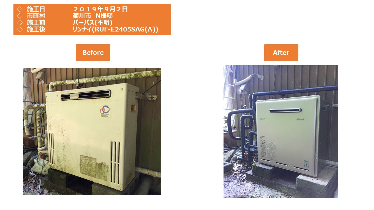 今回のお客様はパーパスの「 不明 」からリンナイの「 RUF-E2405SAG(A) 」への交換でした。