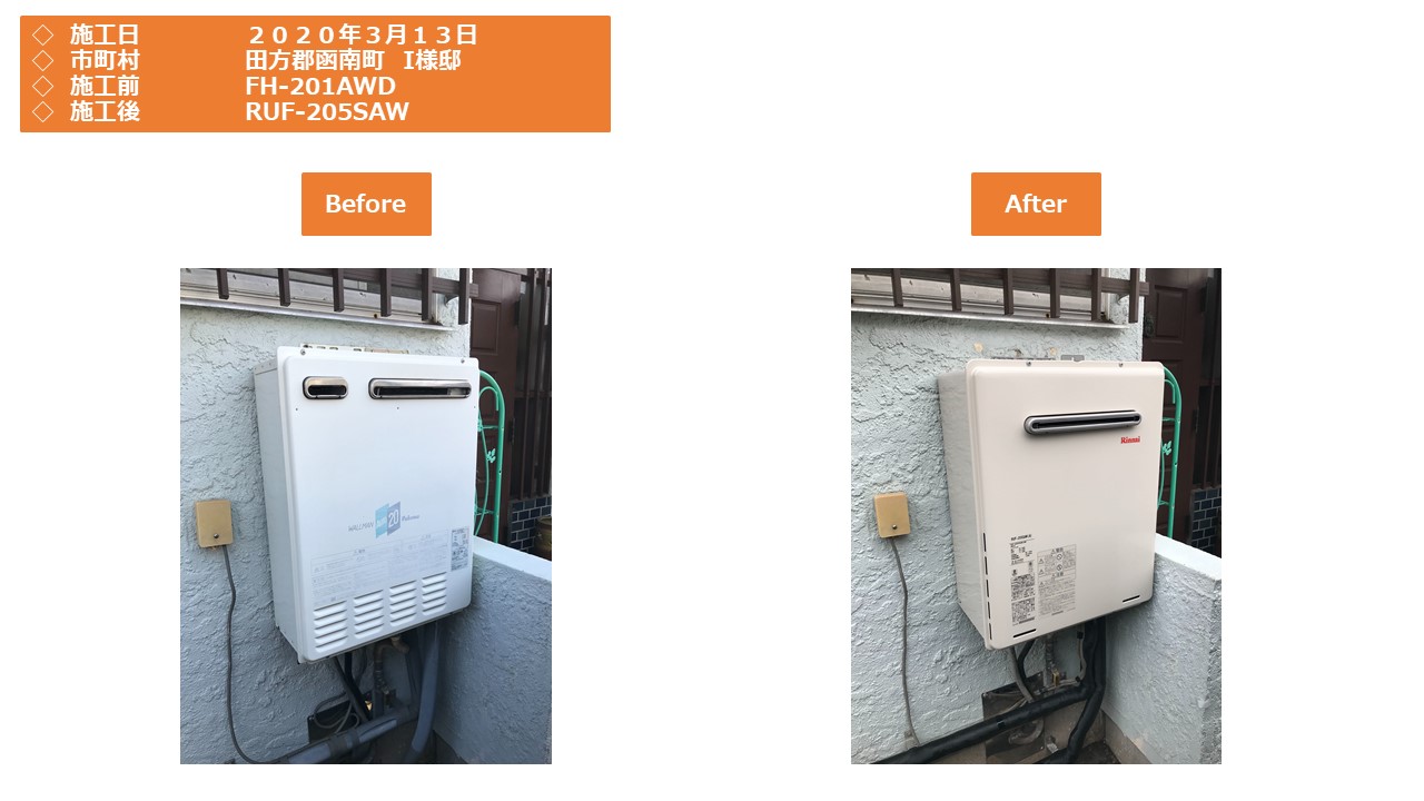 今回のお客様はパロマの「 FH-201AWD 」からリンナイの「 RUF-205SAW 」への交換でした。